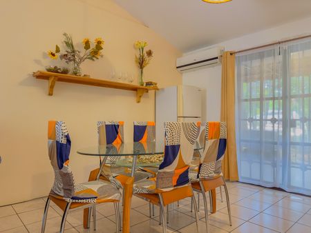 The condo features two comfortable bedrooms and a shared bathroom, an equipped kitchen, and an inviting living area that flows seamlessly onto a private patio and rear terrace.